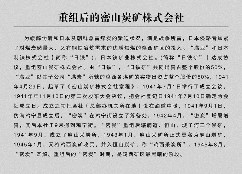 初步形成了伪满时期鸡西矿区的格局。到1940年以后,由于经营日趋恶化,人财物的争夺愈演愈烈,满洲炭矿株式会社走向解体,主要煤矿相继独立,密山、恒山、城子河矿也独立出来,改由“满洲国协和会”代管,直到1941年重组。