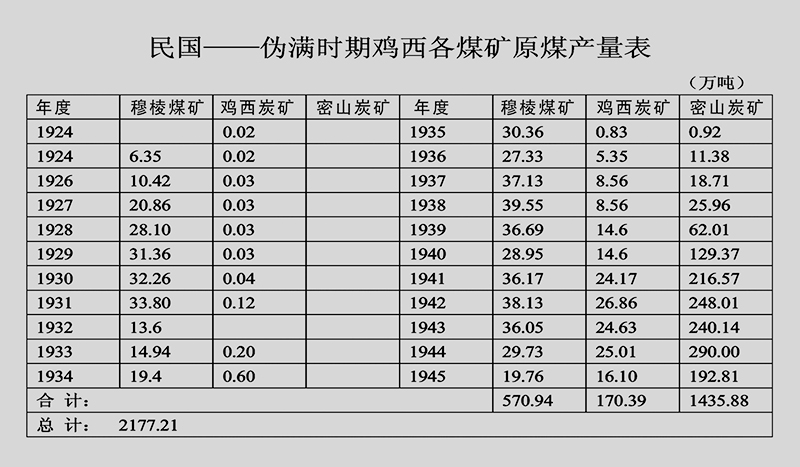 1933年1月初,日本侵略者占领了鸡西地区。从1935年起,就大肆在鸡西地区掠夺式开采煤炭资源,先后建立了滴道炭矿、恒山炭矿、城子河炭矿、麻山炭矿,吞并了鸡西炭矿,还将原“中俄合办”的穆棱煤矿改为“日俄合办”;建立了世界第二、亚洲最大的滴道洗煤厂和发电厂、机械厂等。9年多的时间里从鸡西掠夺煤炭1600多万吨,鸡西的煤炭和森林资源遭到极大破坏。1945年8月上旬,苏联对日宣战后,日军又对矿山进行了疯狂破坏,使鸡西矿区变成一片废墟。在日军殖民统治期间,日寇丧心病狂地残害中国人民,把许多抗日反满人士输送到731部队进行活体实验;惨无人道地奴役中国劳工,劳工吃的是窝窝头子、穿的是麻袋片子、甚至是洋灰袋子、住的是大棚子、死了被扔进山沟子,在日寇铁蹄下惨遭蹂躏的鸡西矿区就是一座人间地狱。