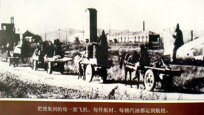东北老航校领导组织全校人员,到各地搜集航材,他们冒着风雪严寒,不分昼夜,不顾个人安危,几乎跑遍了东北地区所有的日伪机场。有的同志在深山挖出被日寇破坏掩埋的航材,有的当地群众把自己装在马车上的飞机轮胎卸下来支援航校建设。在东北民主联军及地方的支持下,用肩挑马拉等办法,把搜集到的每一架飞机,每件航材,每桶汽油,运到航校。先后共收集各型破旧飞机120架、发动机200多台、仪表100箱、油料近1000桶及其它航空器材。