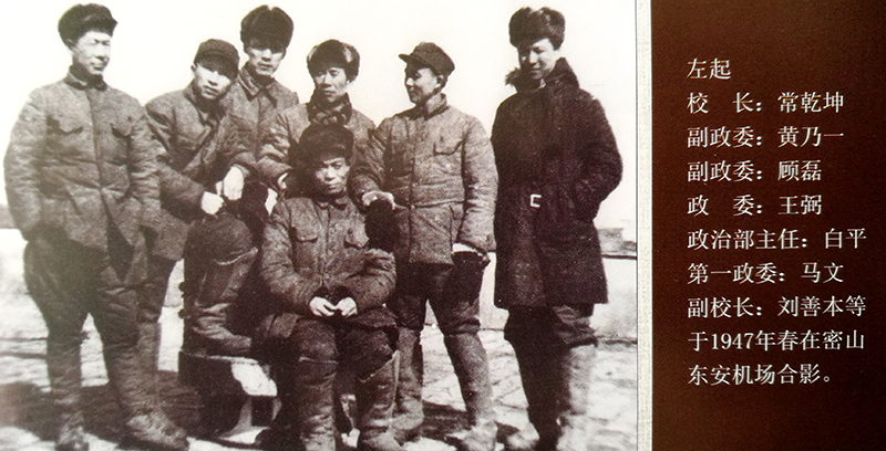 1947年,在东安原日伪加工厂旧址,建立了东安修理厂。由于飞机太大,把飞机运往机场总装。老航校经常举办场站培训班,并选派优秀人员去深造。飞行大队长吴恺,仪表学员曹德山,副校长刘善本,编译室主任杨劲夫,训练处长吕黎平等人。校长常乾坤、政委王弼等人1947年在东安校部留影。