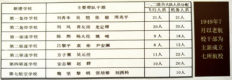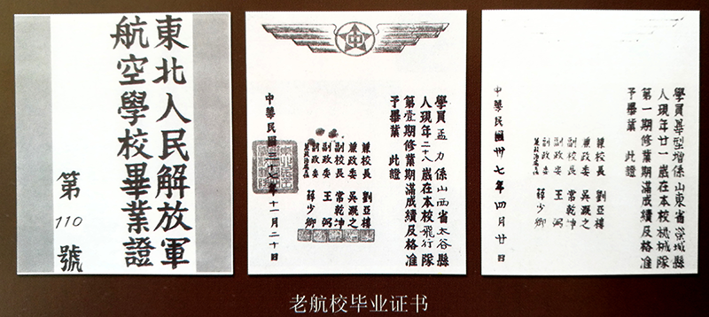 1949年3月中央军委决定成立航空局,任命常乾坤为局长、王弼为政治委员。同年11月,党中央决定建立空军并组建七所航校,将东安(密山)老航校技术骨干分配到两个轰炸学校、四个驱逐学校及相继新建的第七航校。并选派了各新建航校的主要带队干部。当年老航校训练用的九九式高级教练机,现收藏在中国人民解放军军事博物馆。老航校颁发的毕业证书。