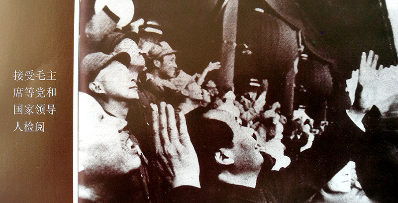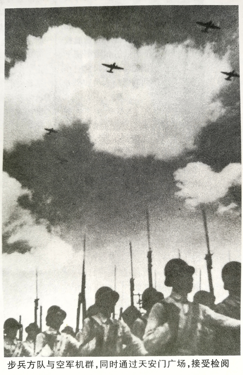1949年10月1日下午4时35分,开国大典阅兵式的分列式开始。17架飞机分成6个分队,在空中领队邢海帆的号令下,各分队保持规定的高度差、速度和时间,由东向西依次进入航线。当空中机群轰鸣着通过天安门广场上空时,“我们的飞机编队飞过来了!”天安门广场顿时成了一片欢呼的海洋。 毛主席等党和国家领导人检阅空中机群,并向空中机群招手致意。