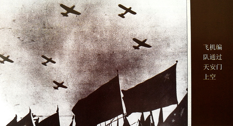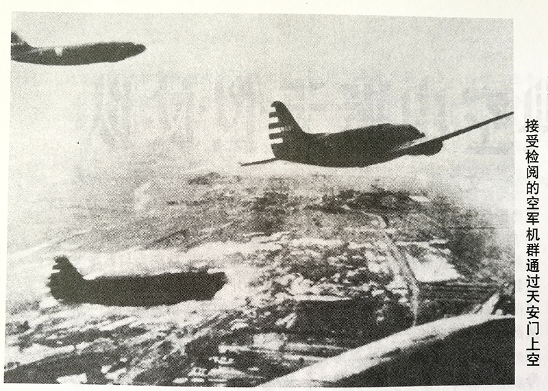 在前面的9架P-51战斗机刚飞过天安门上空,又从复兴门上空作右后转弯,沿北城墙上空返回东单,正好与最后的教练机编队衔接,又一次飞过天安门上空。后来,不明真相的外电纷纷报道:神秘的中国空军出动了以野马式战斗机为主的26架飞机参加开国大典。