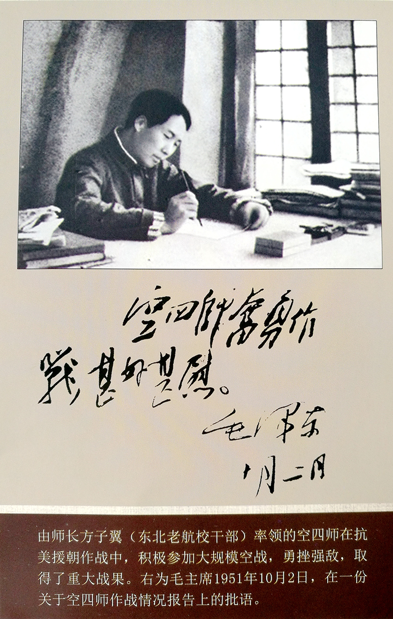 1951年10月2日,毛主席在空四师作战情况报告上的批语“空四师奋勇作战,甚好,甚尉”。空三师在86天作战中,创击落击伤敌机63架,(其中击落54架)的突出战绩。1952年1月30日,毛主席在空三师作战情况报告上的批语,“向空三师致祝贺”。
