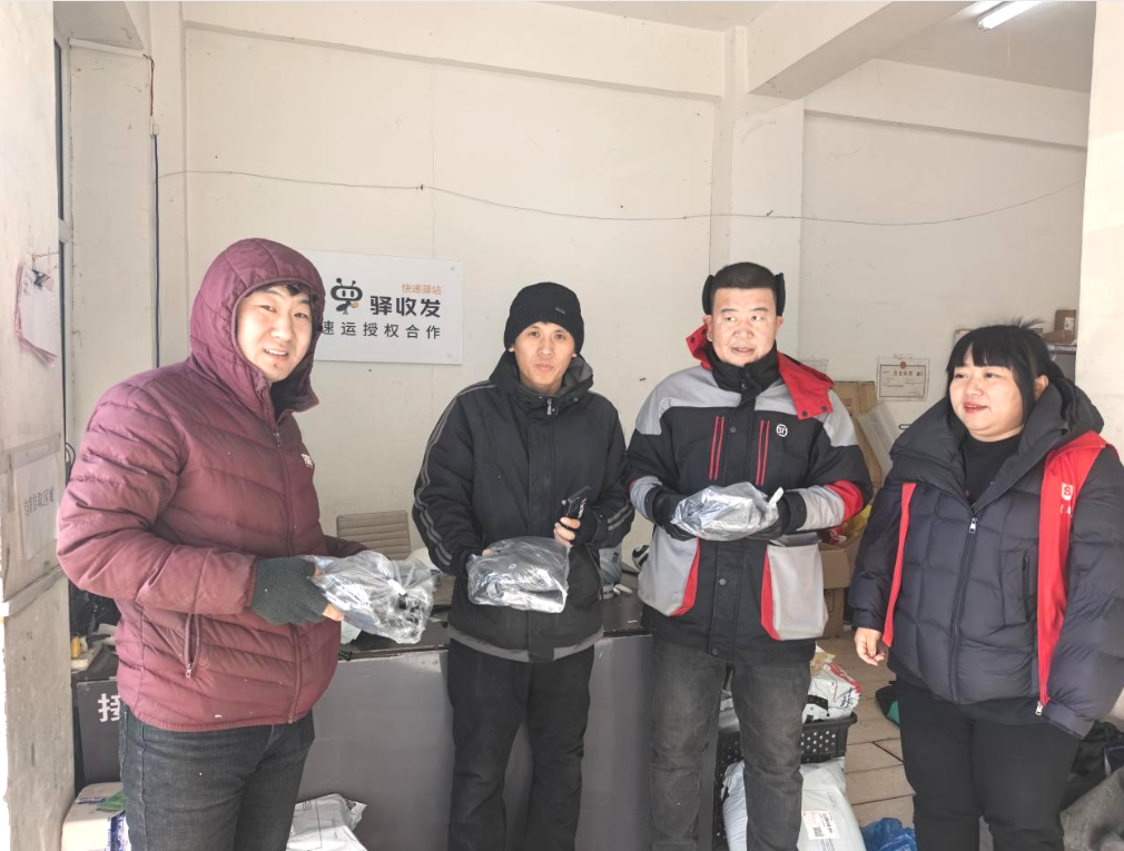与此同时,建国社区的慰问队伍带着20份暖心礼包,走进辖区快递驿站。驿站内一派忙碌,快递小哥正快速分拣包裹,手套上还沾着室外的寒气。“天冷,先歇会儿,给大家送‘抗冻装备’!”社区工作人员的声音刚落,正在分拣生鲜包裹的李师傅立刻停下手中的活,接过帽子试戴后笑着说:“这帽子太实用了,之前骑电动车风吹得头疼,现在终于能护住了!”其他快递小哥也围了过来,有的当场戴上脖套,有的拿着物资和工作人员合影,驿站里满是欢声笑语。