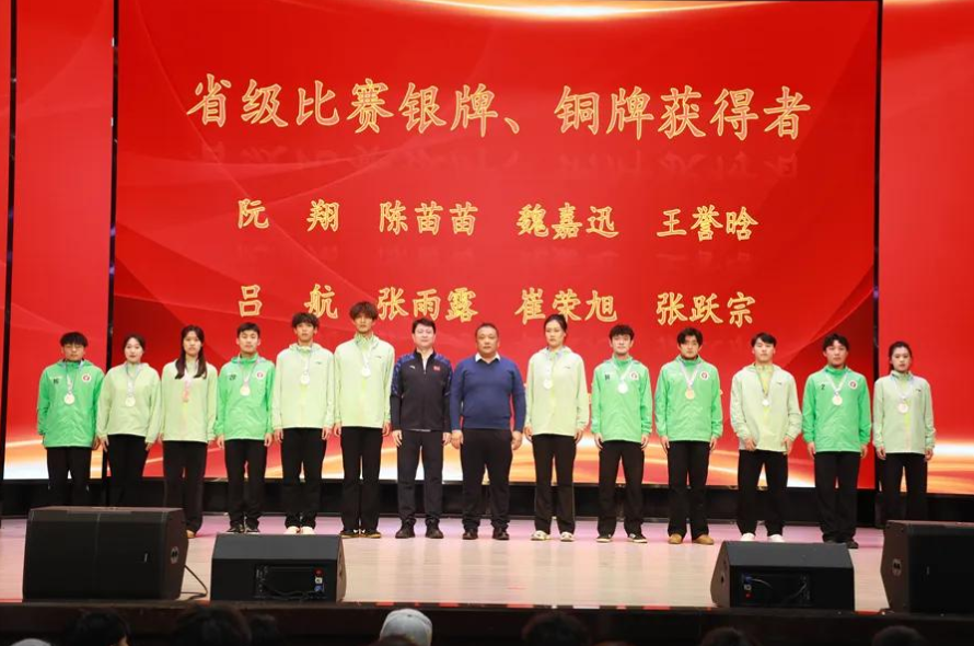表彰环节在欢快的乐曲声中有序进行,优秀教练员、校级优秀运动员及省级比赛奖牌获得者分批上台领奖,接受全校师生的祝贺。随后,教练员代表与运动员代表先后发言,分享了刻苦训练、顽强拼搏、团结协作的奋斗故事,表达了续写佳绩的坚定决心,真挚的情感引发全场强烈共鸣。
