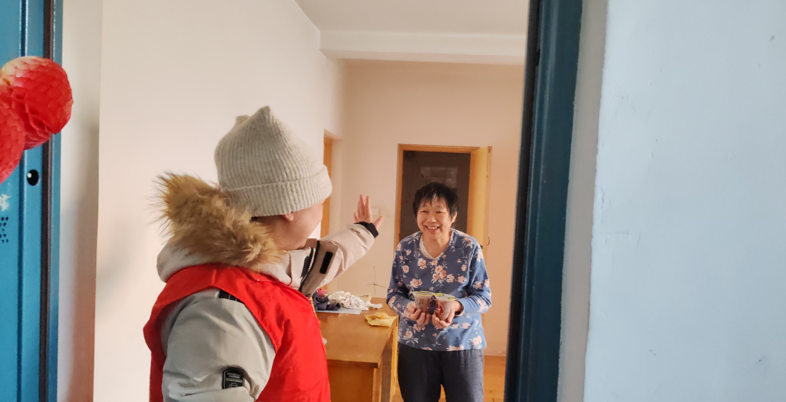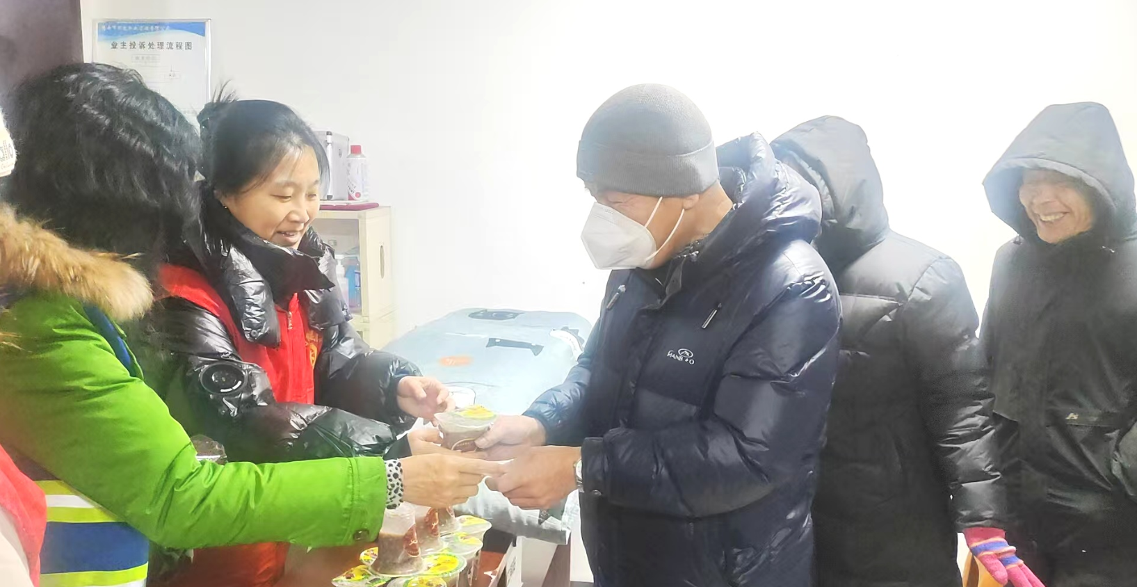 除了集中发放,社区党委与物业还组成慰问小队,将粥分装送至高龄独居老人、困难家庭中。“天这么冷,还特意起大早爬楼送来,太谢谢了!”张大娘连声道谢。队员们不仅送上节日祝福,还关切询问了他们的近况,帮忙检查家中水电安全,将节日问候与日常关怀融为一体。