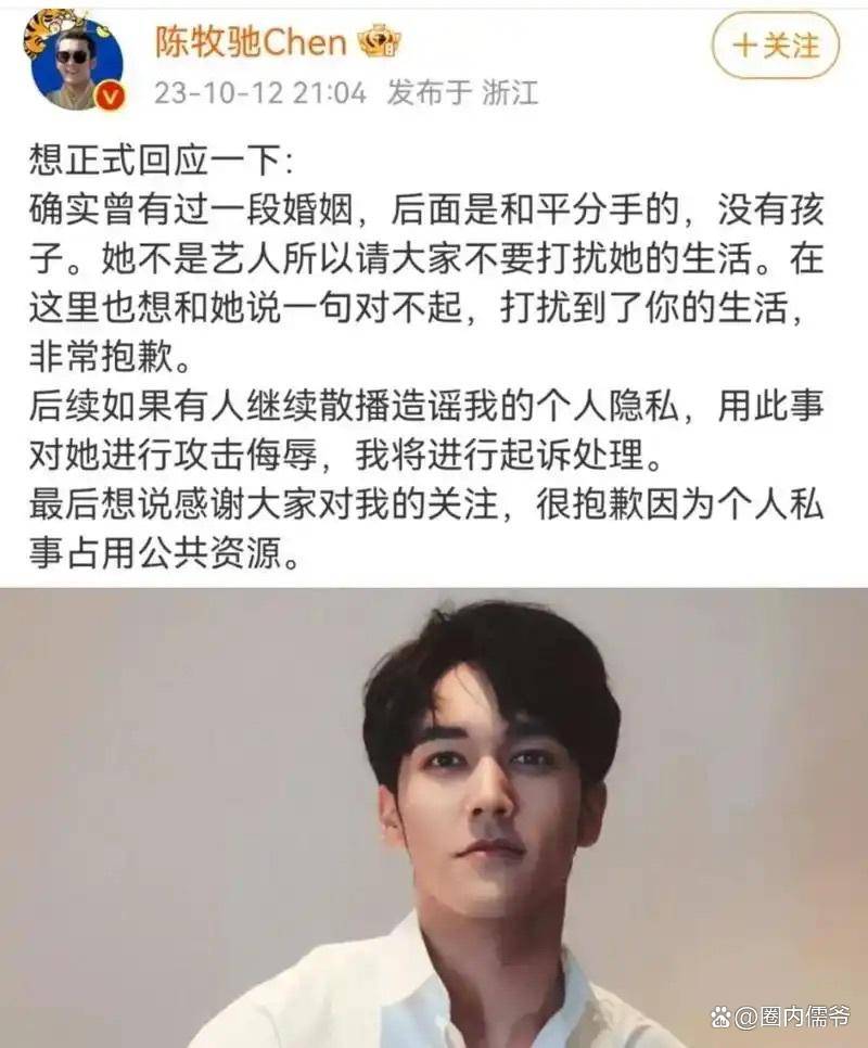 2023年10月,陈牧驰的个人隐私(包括身份证号、婚姻登记信息)遭恶意泄露。网友扒出其曾于2020年与《封神》剧组工作人员罗晨登记结婚,2021年8月离婚。陈牧驰于10月12日发微博承认婚史,强调前妻为素人且无子女,但这一回应反而引发对其"隐婚"动机的质疑。