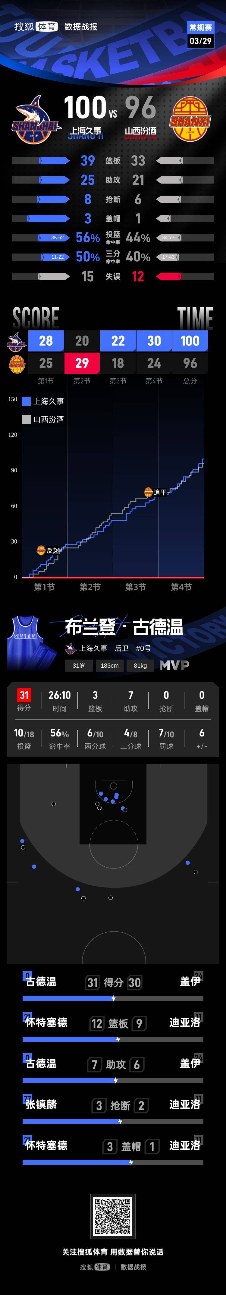【搜狐体育战报】北京时间3月29日CBA常规赛第32轮,客场作战的上海久事以100-96击败山西汾酒,上海久事取得13连胜。哈桑·怀特塞德17分12篮板2助攻,凯尔·盖伊30分3篮板6助攻。